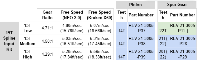 | REV-21-3005-P37 | 3in MAXSwerve Module - Drive Motor Pinion - 15T Spline Bore - 14T | QTY 1 |